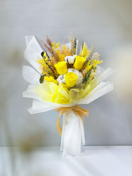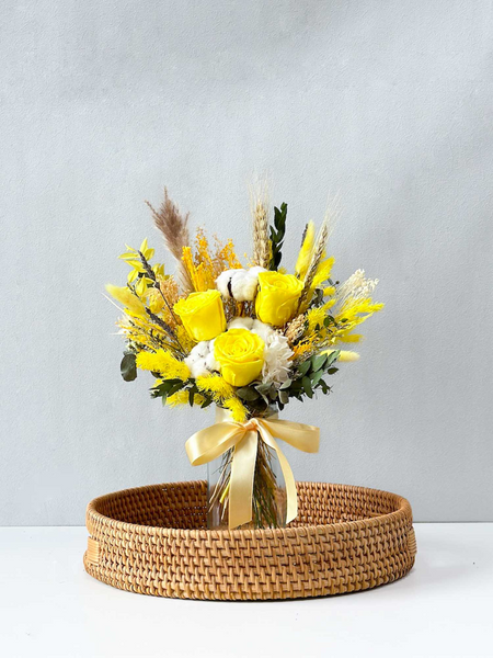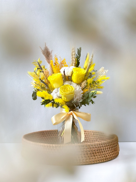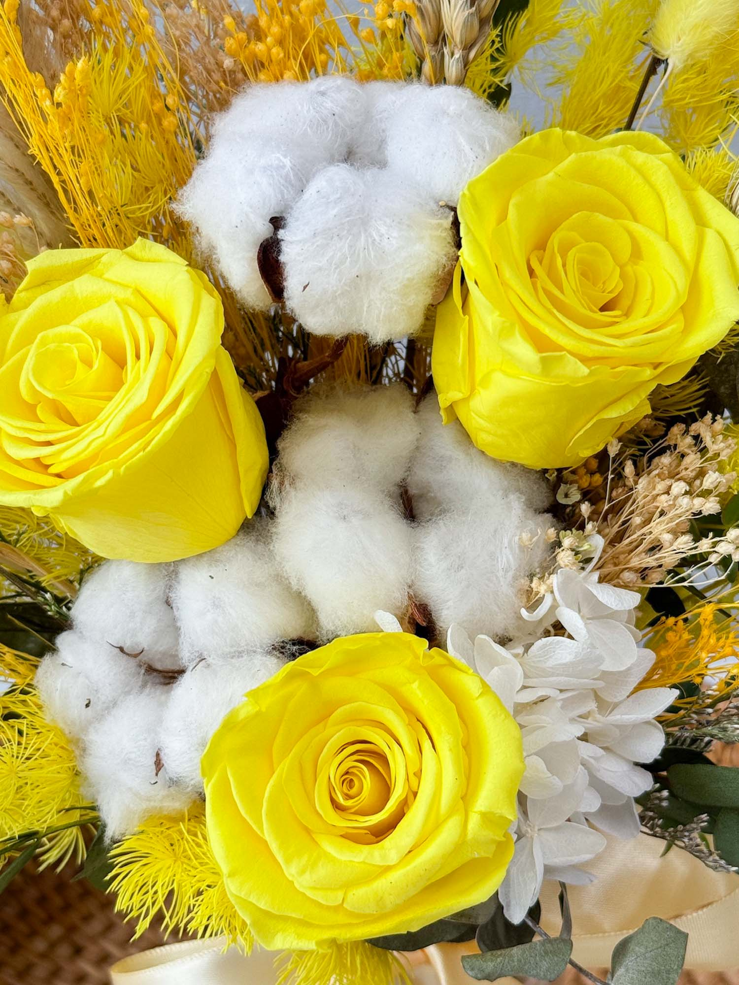 For love that’s joyful and uplifting, our Breezy Bayfront bouquet in cheerful yellow tones adds a burst of sunshine. With preserved roses, cotton puffs, and rustic blooms, this eco-friendly bouquet is low-maintenance—a vibrant gift that brings warmth and happiness for months.