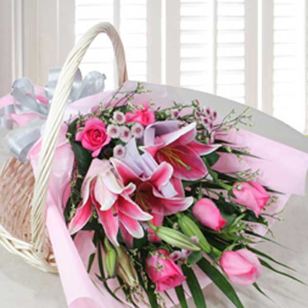 3 Pink Lilies 6 Pink Roses Handbouquet