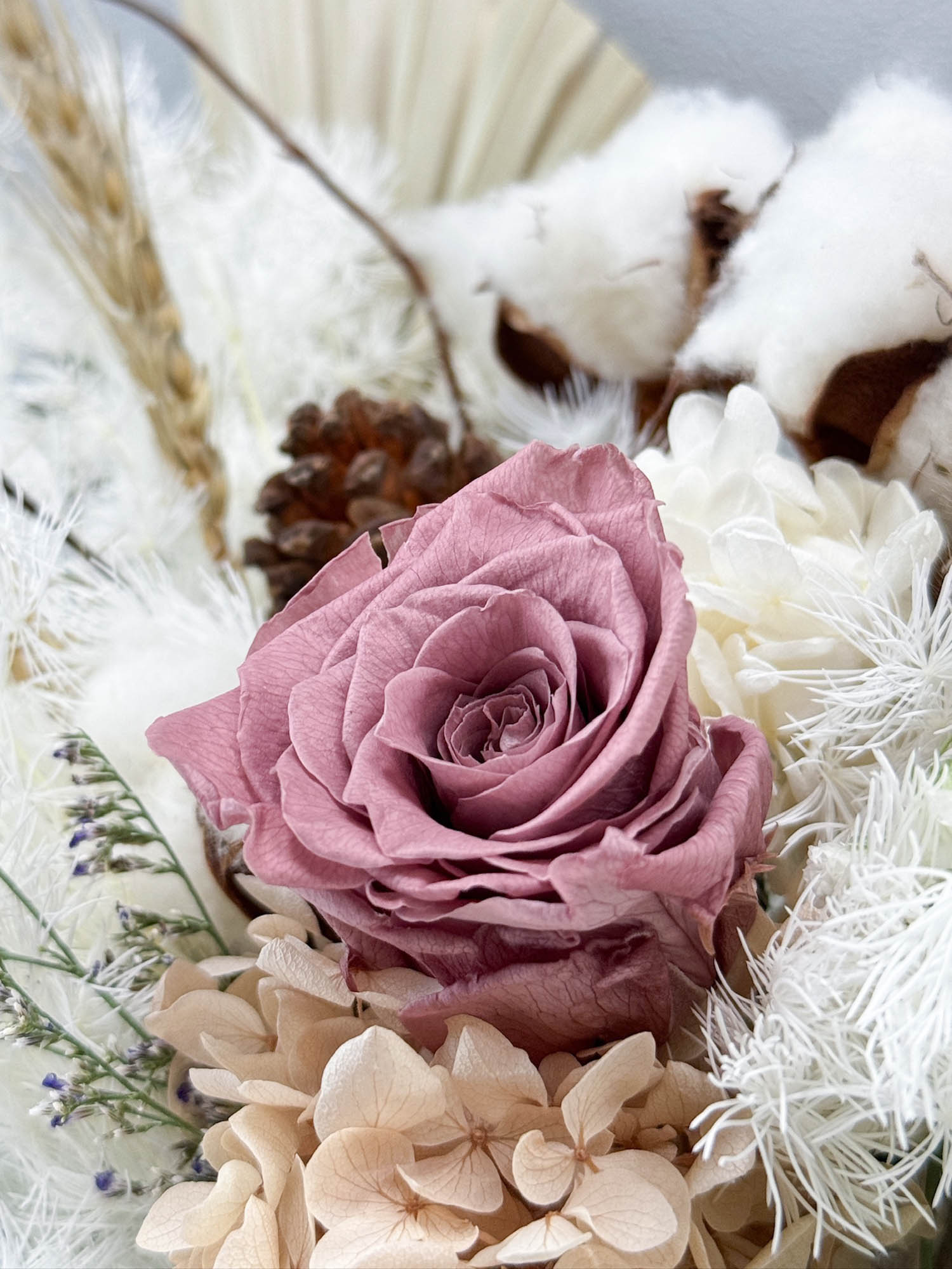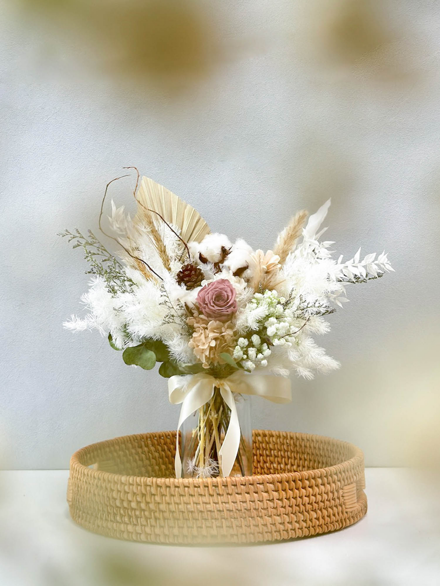 This unique arrangement features a captivating blend of preserved blooms in soft, creamy hues, reminiscent of a delicious cup of milk tea. Delicately arranged within a stylish vase, this creation adds a touch of sweet indulgence and bohemian charm to any space.