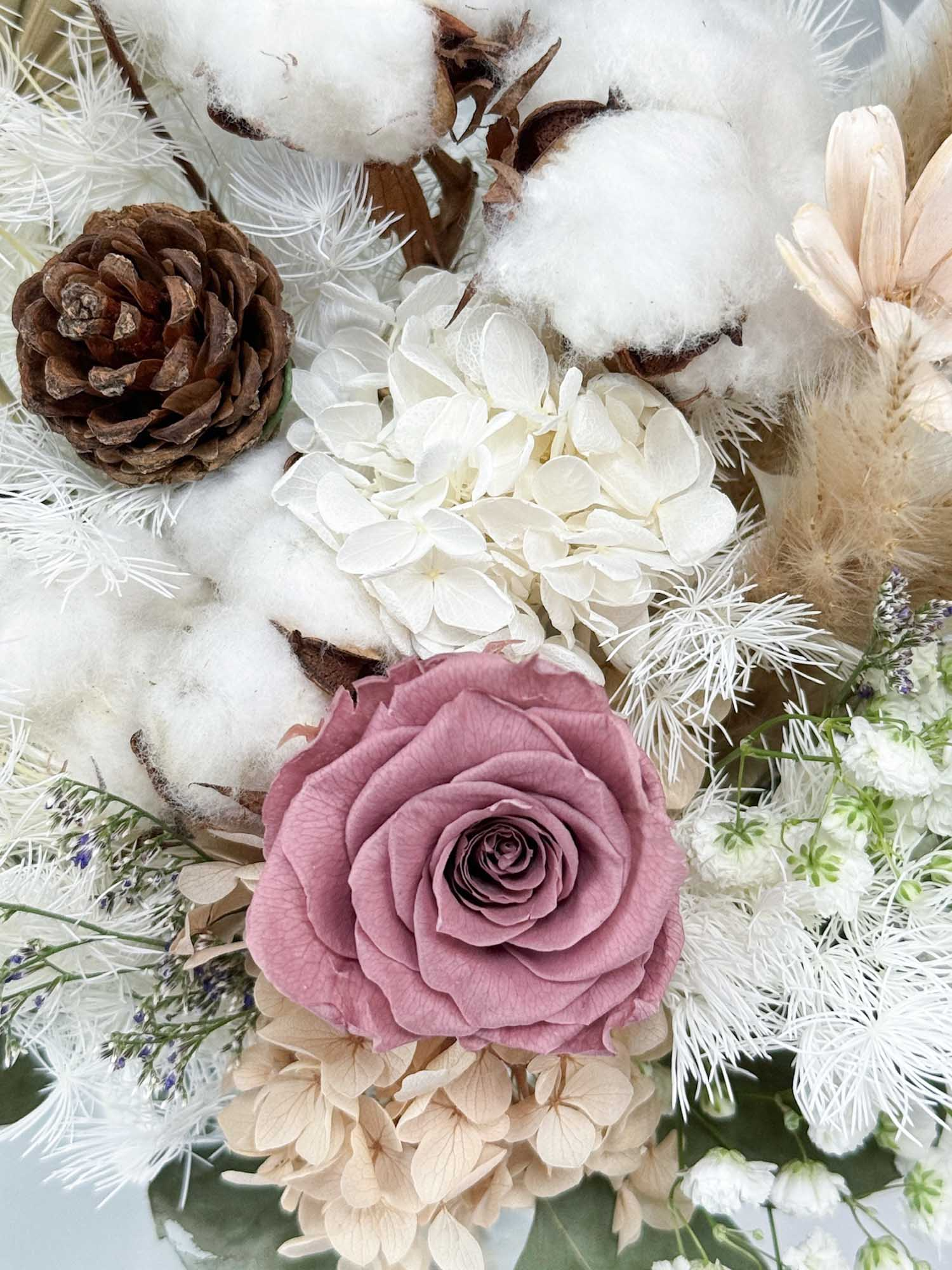 Due to seasonal and natural factors, the colours of some flowers and leaves may vary. Likewise, some preserved bouquets contain hand-painted sola flowers making their design one and only in the entire world. If there are some blooms not available, we may substitute similar or superior blooms to maintain the overall style, making your bouquet uniquely yours.