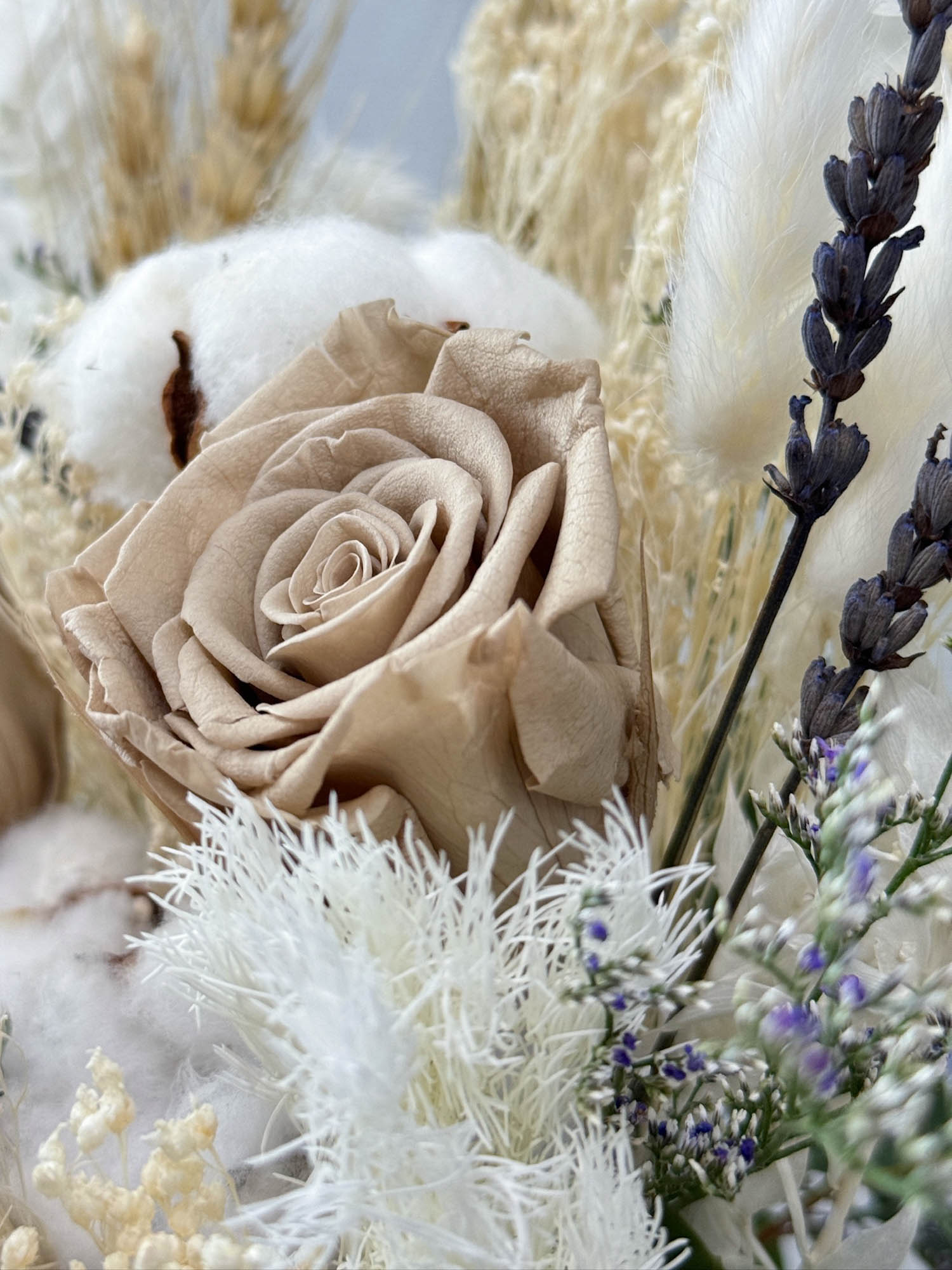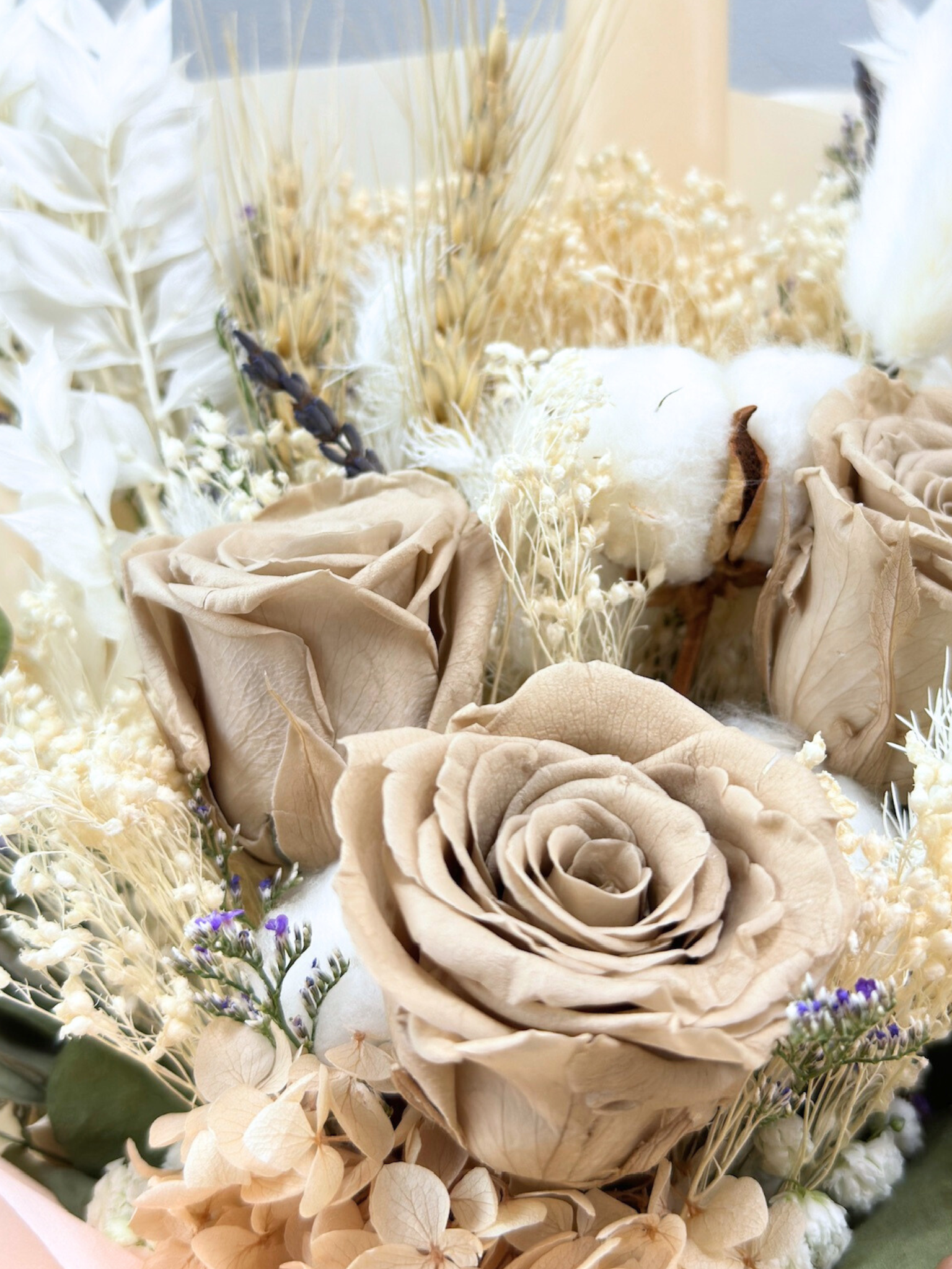 For love that’s grounded and lasting, our Breezy Bayfront bouquet in natural khaki tones brings warmth and sincerity. With preserved roses, cotton puffs, and rustic blooms, this eco-friendly bouquet is low-maintenance, a heartfelt gift that’s easy to cherish for months.