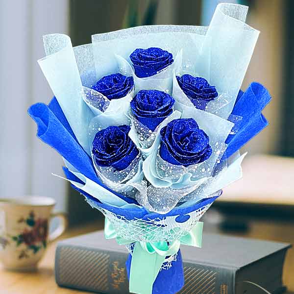 6 Artificial Blue Roses Hand Bouquet