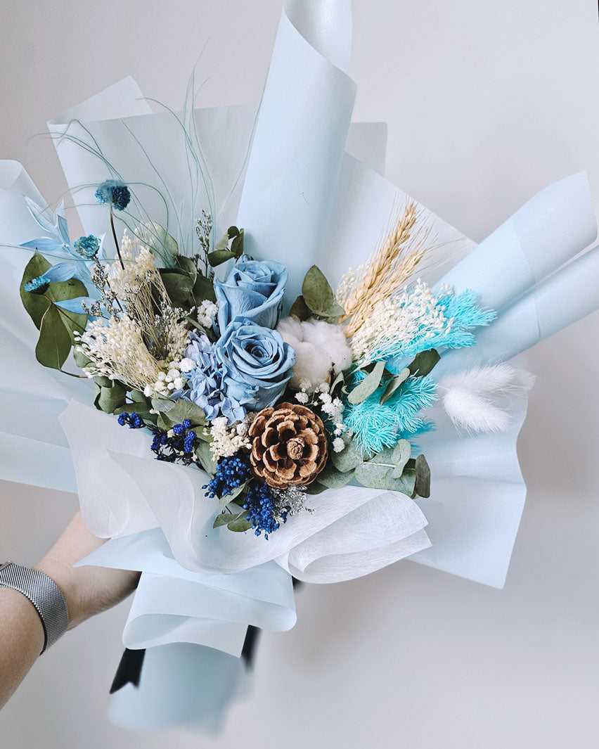 Blue Preserved Roses arranged with cotton bud and pine cone, wrapped in blue for your special someone!