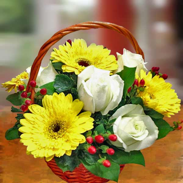 5 Yellow Gerbera & 4 White Roses In Small Basket