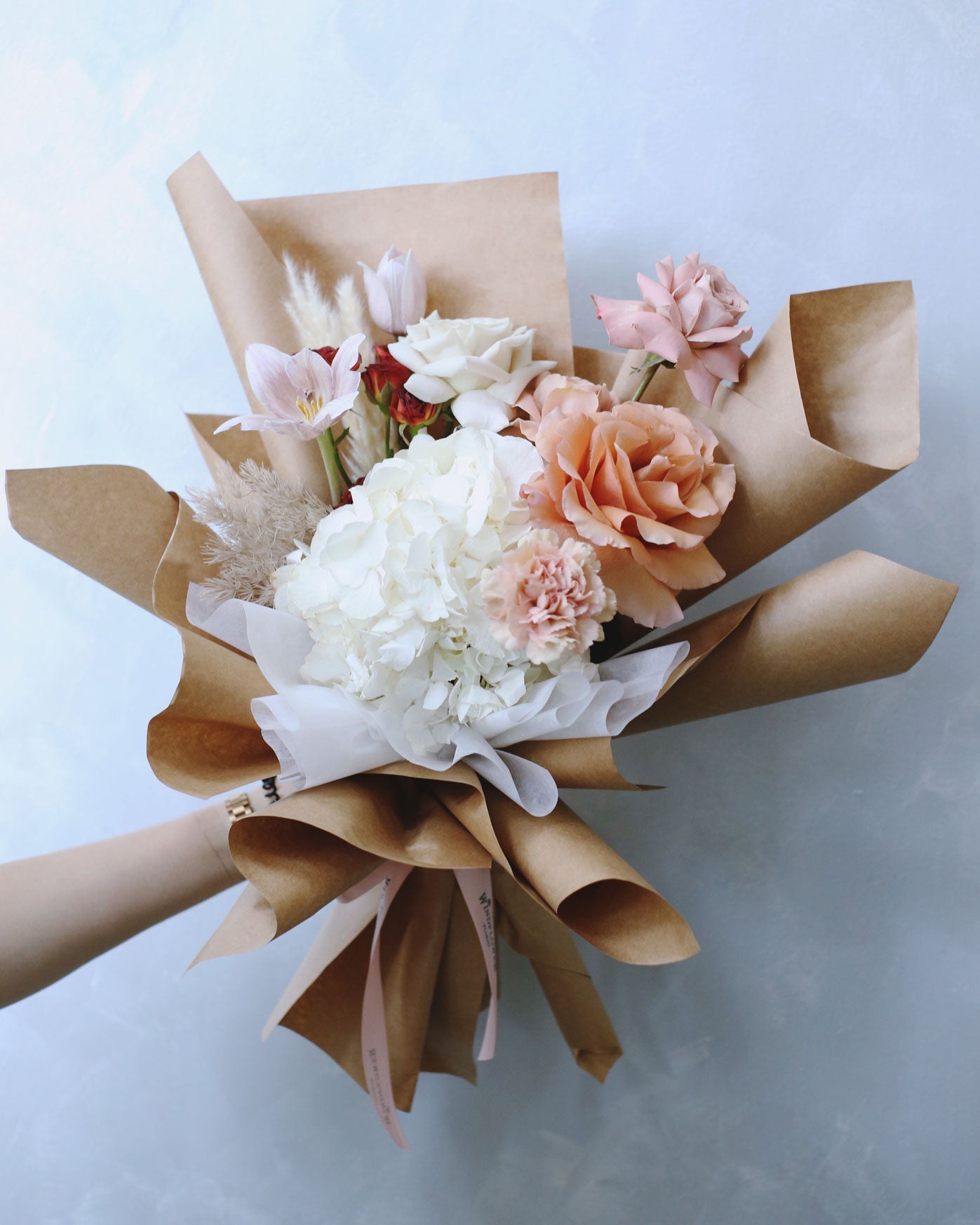 Many of you commonly ask us, "How do we keep our bouquets fresh ah? I need them for an event." All fresh bouquets will be delivered to you "Aqua wrapped" (with plastic) to keep them happy and hydrated. Dried preserved bouquets don’t have. If you're using the bouquet for an event, place it in an air-conditioned room and give it a gentle misting. Don't forget to remove the plastic and pat the stems dry to avoid a watery mess.