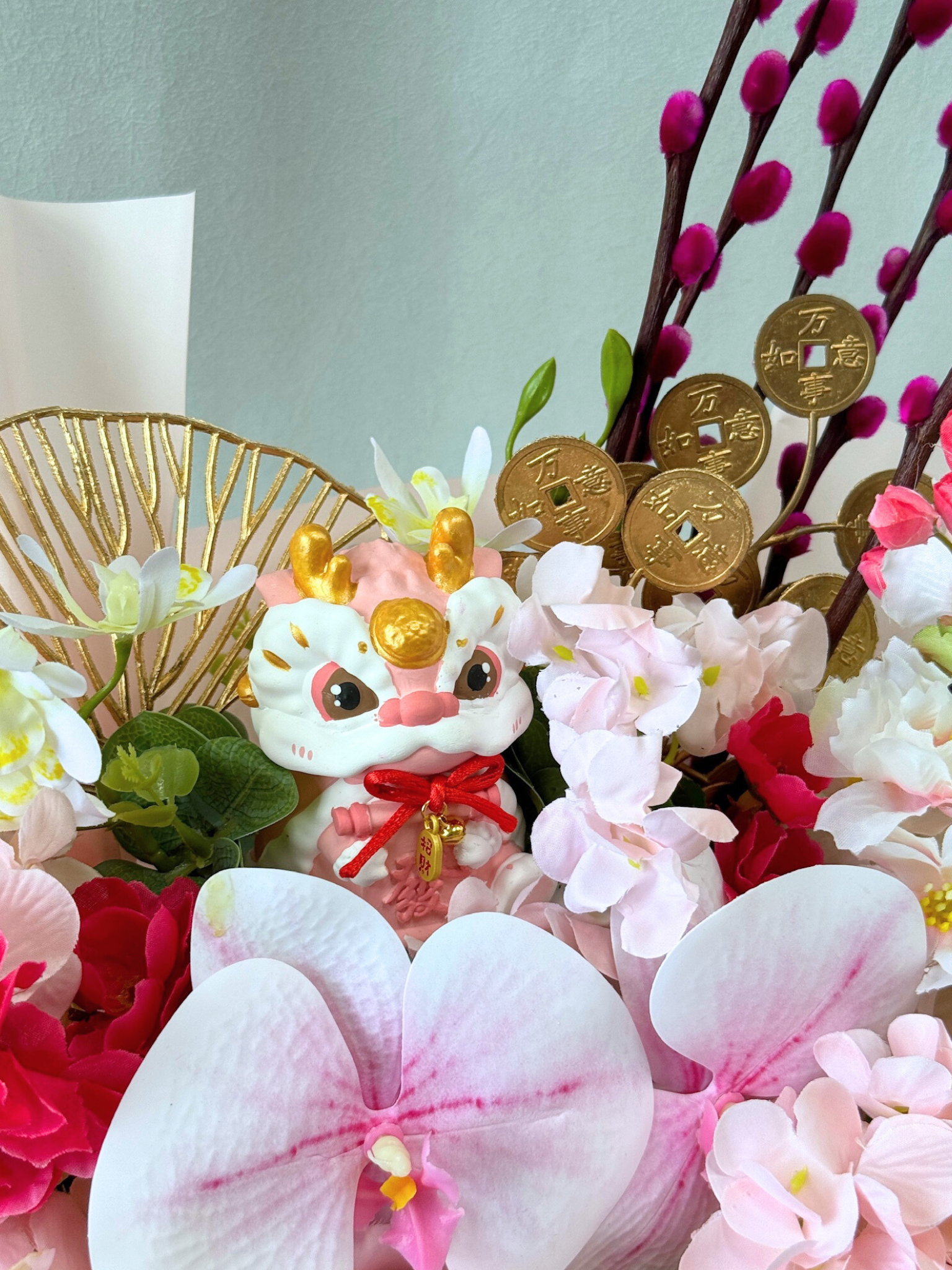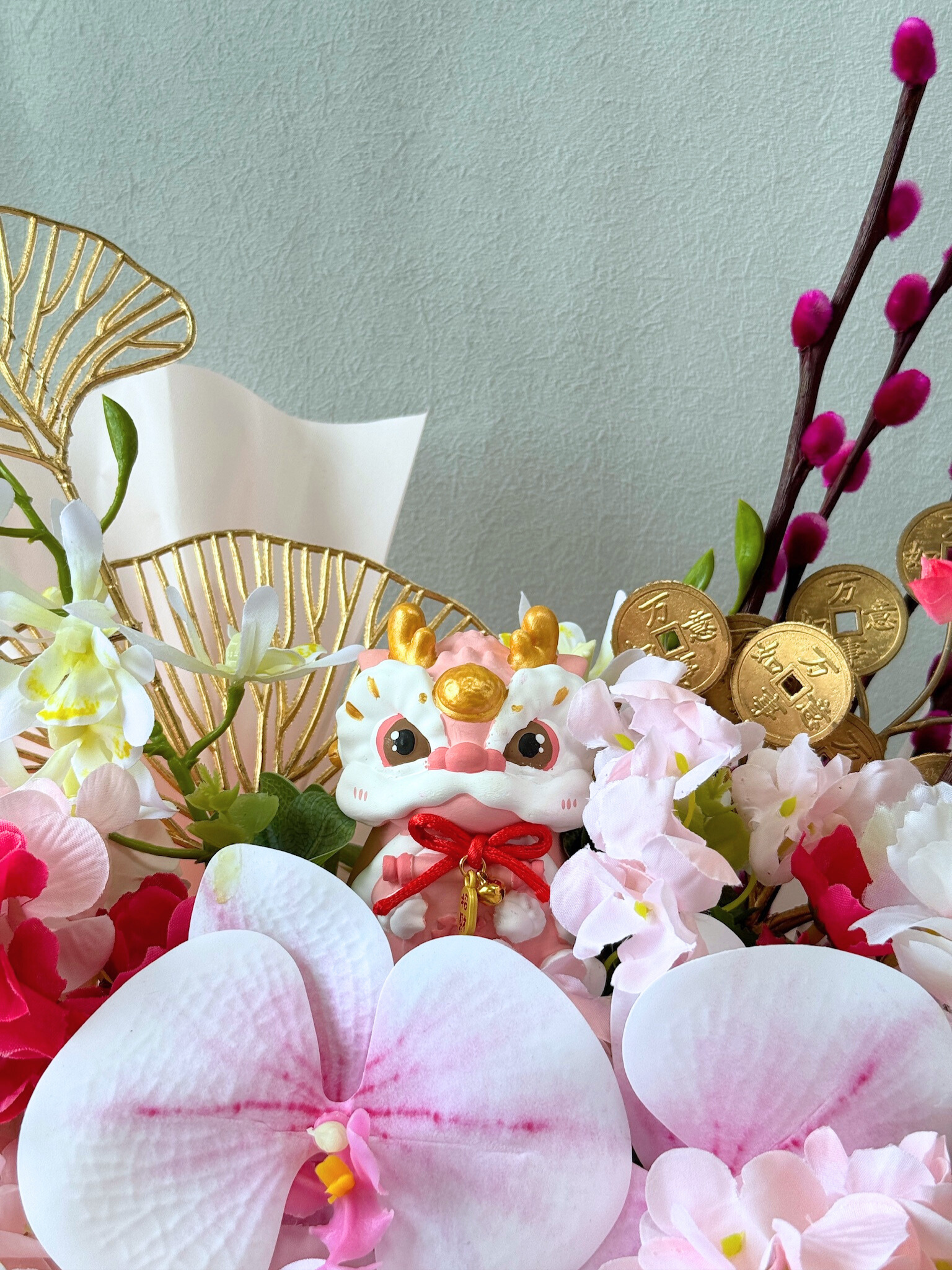 Attract wealth and prosperity with the 'Orchid Lion Bloom (Fa Cai).' This captivating centerpiece features a playful lion miniature nestled amongst a vibrant arrangement of artificial orchids and faux decorative blooms.