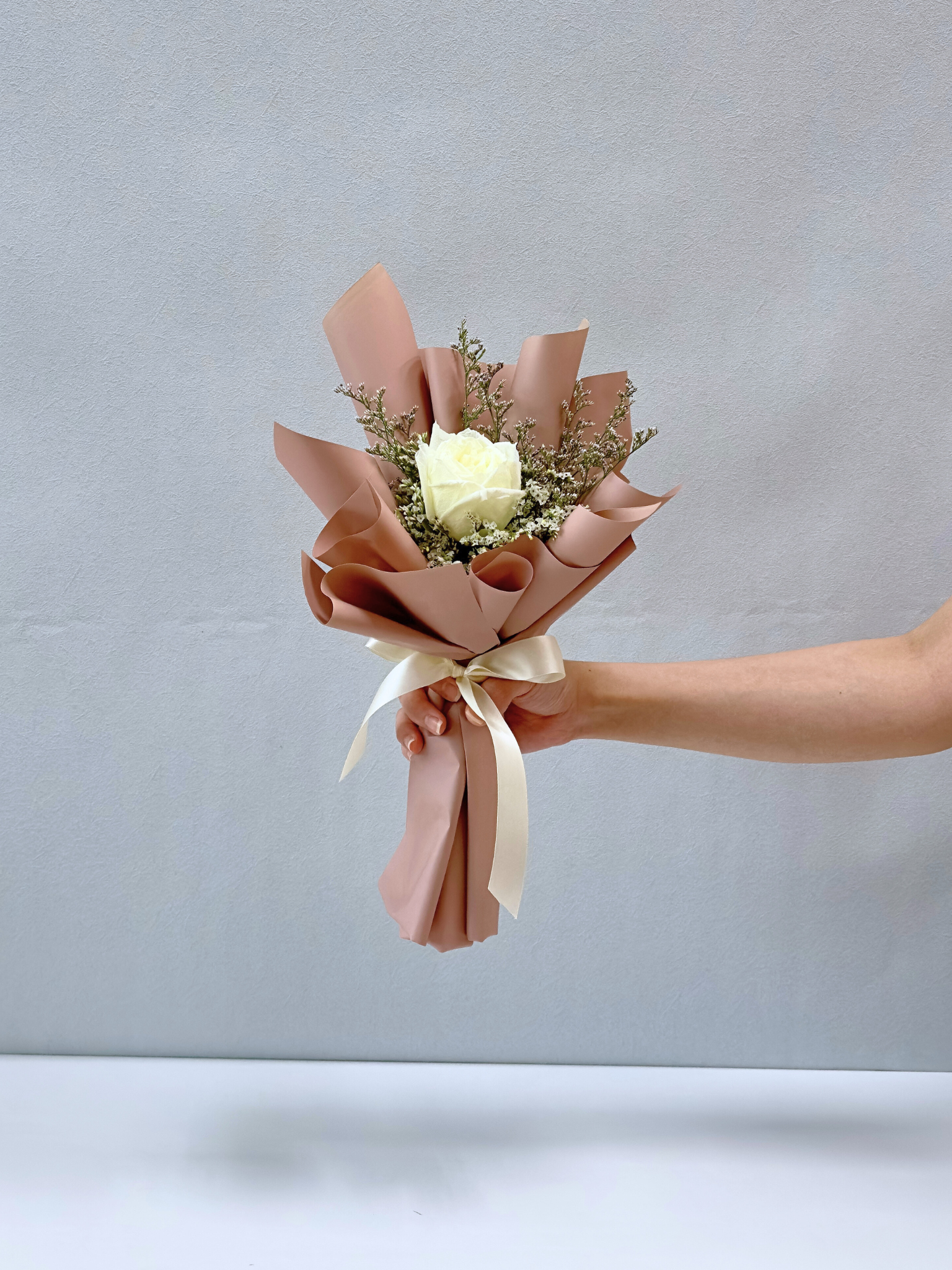 Ngl, photos are taken with our iPhones and by 2 clueless but adorable “interns”. As much as possible, we try our best to just edit only the ugly fine lines and wrinkles on the background of the photos. Lightings and exposures have also been adjusted. So, the colours in our photos might look slightly different from the actual bouquets. But hey, we promise to constantly improve ourselves to serve you better.
