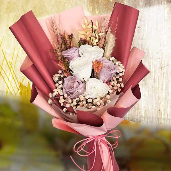 Preserved Roses ( 3 White 3 Purple ) With Dried Flowers Hand Bouquet