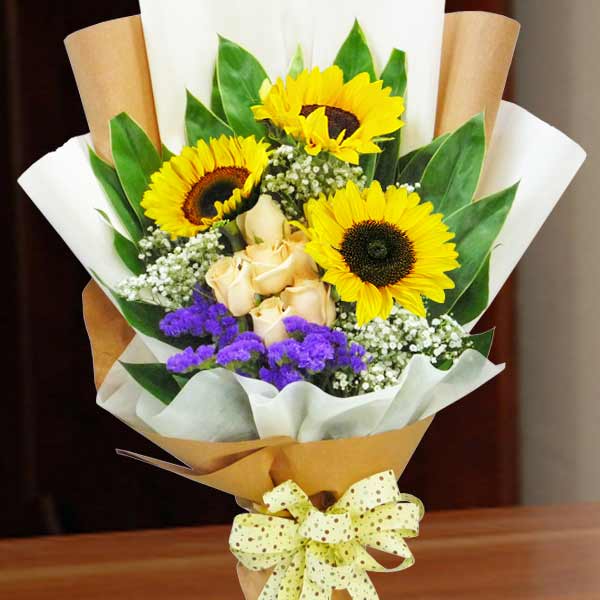 3 Sunflower and 6 Champagne Roses Handbouquet
