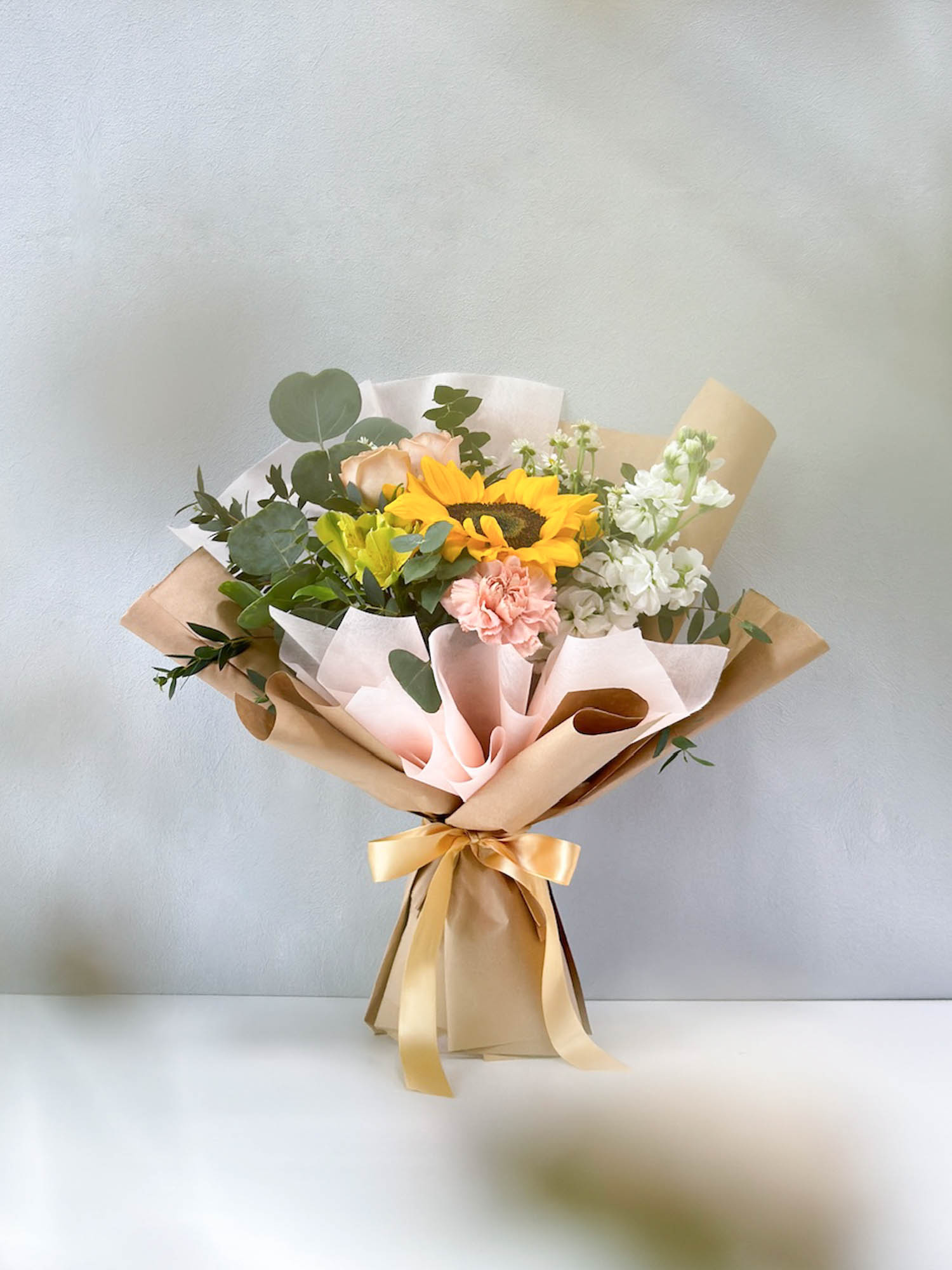 A playful nod to Tanjong Pagar, with a touch of hustle. For the ones who hustle hard and stay ultra-focused, our Tanjong Tussle bouquet is a bright reminder to pause and soak in some joy. With a lively sunflower at the heart, surrounded by soft pink and white blooms, this bouquet brings a pop of cheer to their day—a little sunshine to say, “Take it easy lah!”