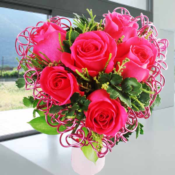 6枝亮粉色玫瑰搭配心形铁丝网立式花束